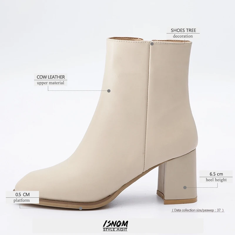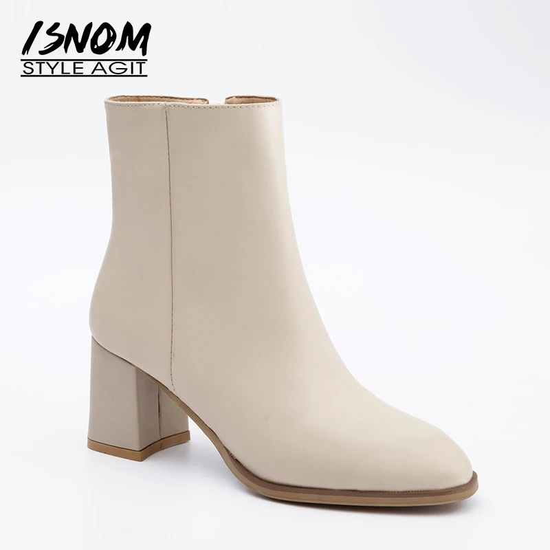 NEW ISNOM Genuine Leather Women Boots Autumn Fashion Round Toe Ankle Boots Shoes Short Plush 2019 Winte