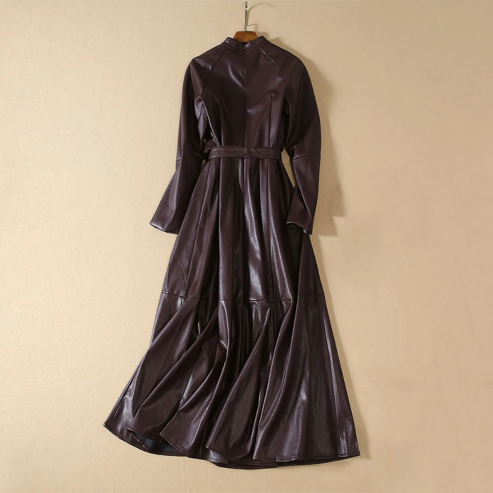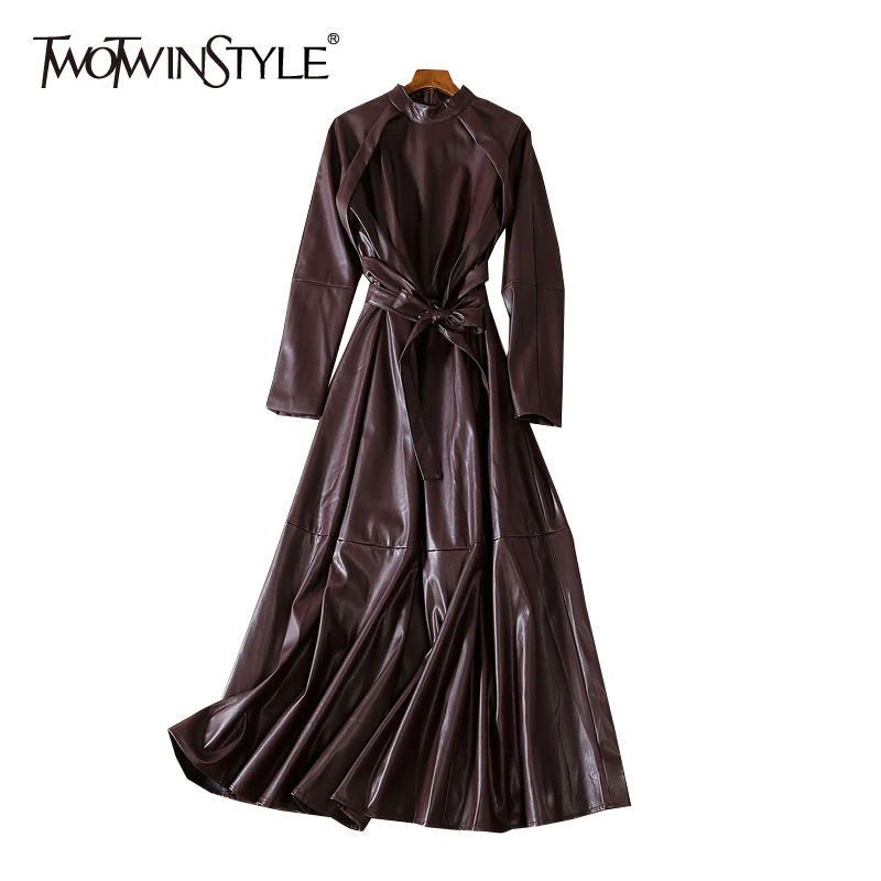 Hot TWOTWINSTYLE Leather Autumn Dress Women Stand Collar Long Sleeve High Waist Lace Up Solid Midi Dres