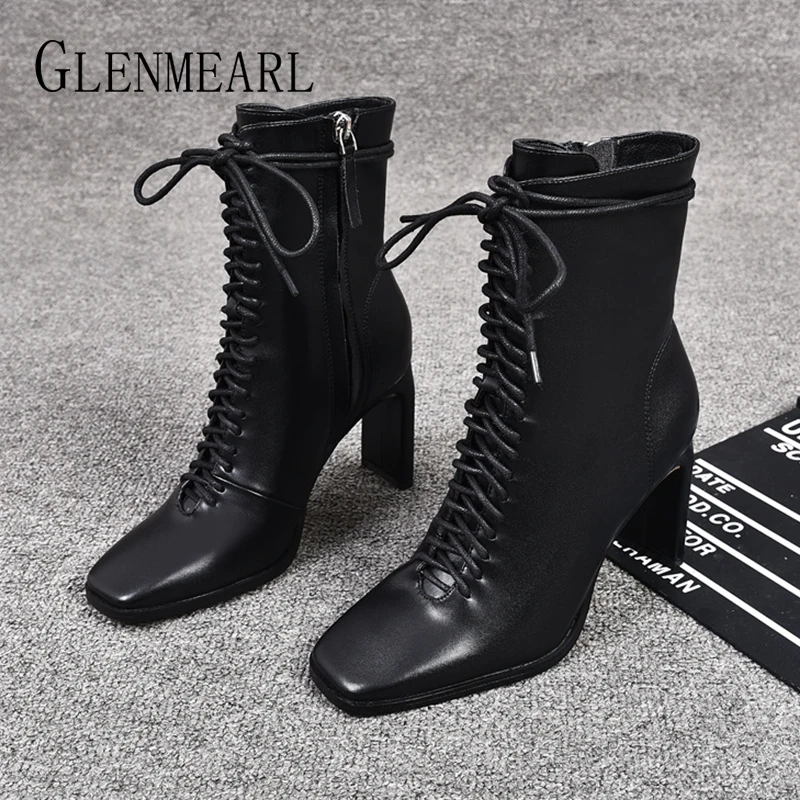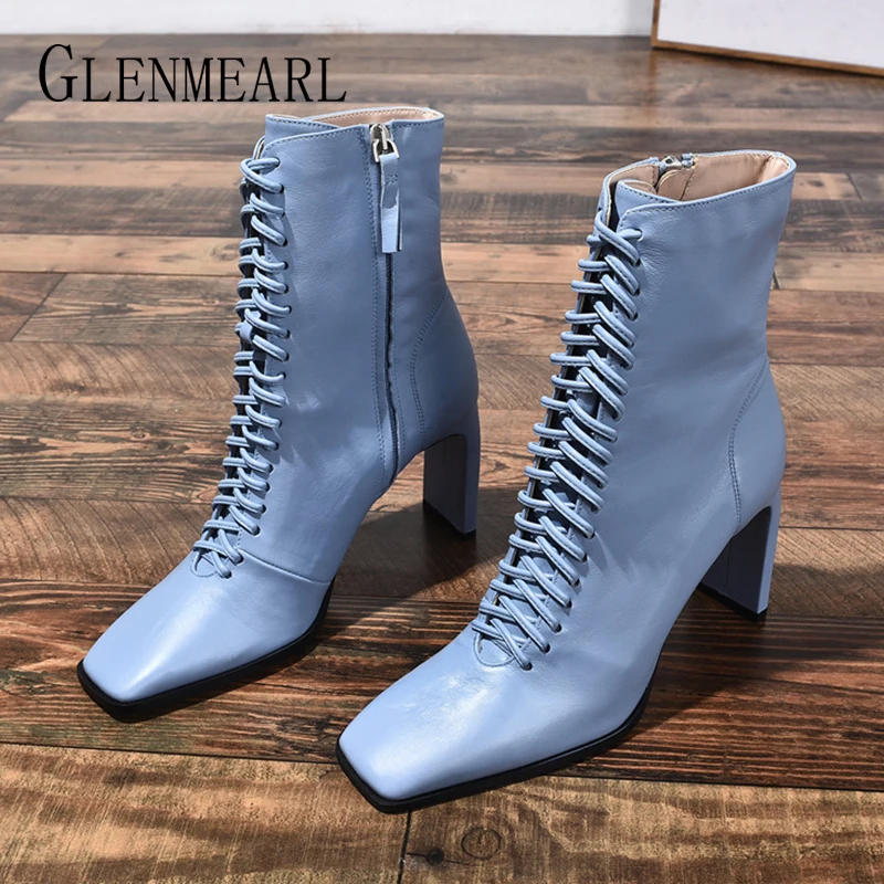 Buy Women Leather Boots Fashion High Heels Shoes Winter Lace Up Woman Martin Boots Square Toe Ankle Boo