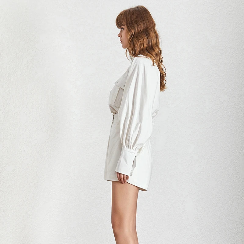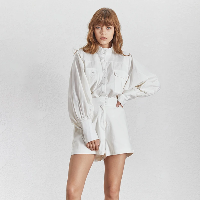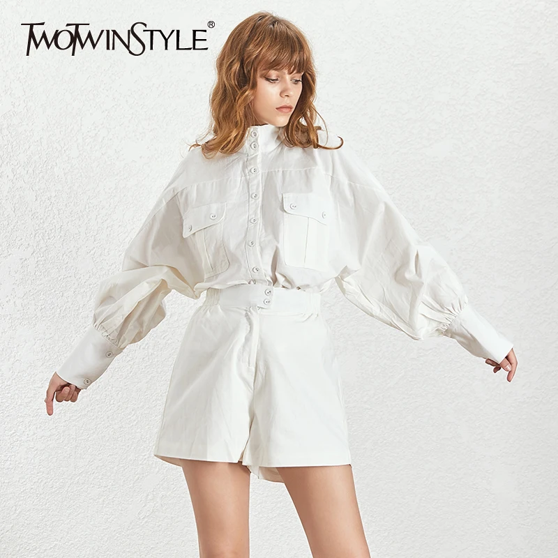 Hot TWOTWINSTYLE White Shirt Shorts Women Two Piece Sets Lantern Sleeve Blouse Female High Waist Shorts