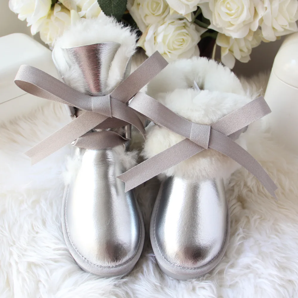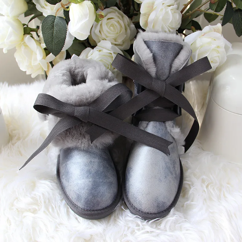 Get Hot Selling Women Winter Boots with Bowtie Lace Up with Natural Fur Lined Women Fashion Genuine Lea