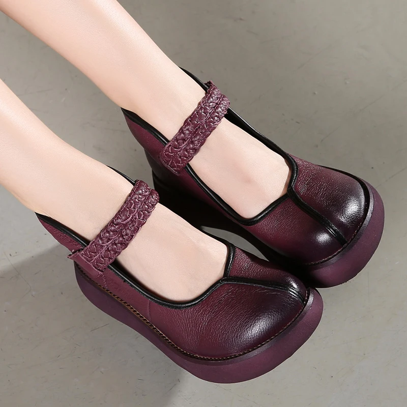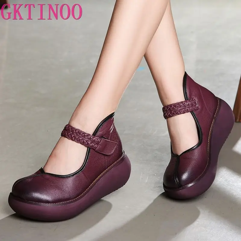 Get 2019 Spring Genuine Leather Women Pumps Platform Wedges Round Toes Ankle Strap High Heel Women Shoe