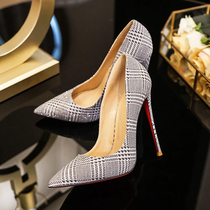 Discount Bling Checkered Women Sexy Pumps Red Bottom Shoes Shallow Thin Heels Stilettos Spring Autumn Weddin